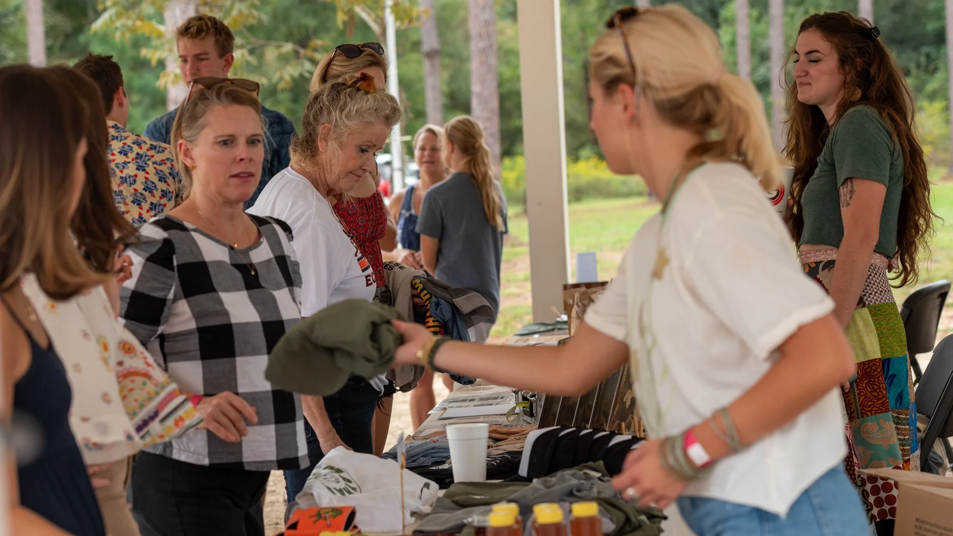 Merch table in the pavilion. Morgan Stickler and Chloe Kimes moving the merch!